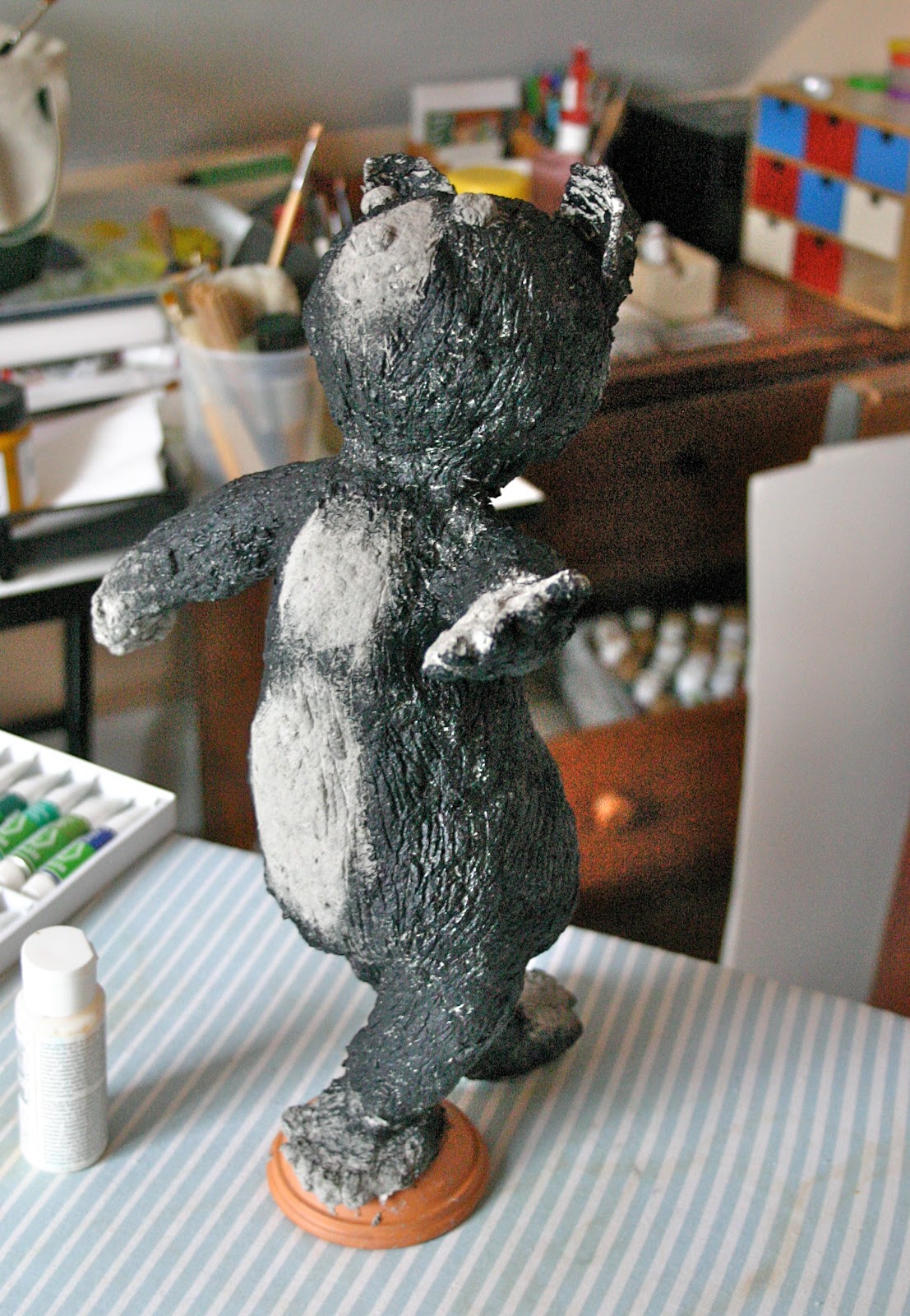 I DID NOT USE JONNI'S RECIPE(S) as this was a serendipity activity! First I constructed the base (pic of cat on my piano); next I applied my paper mache (cat form with grey material).
